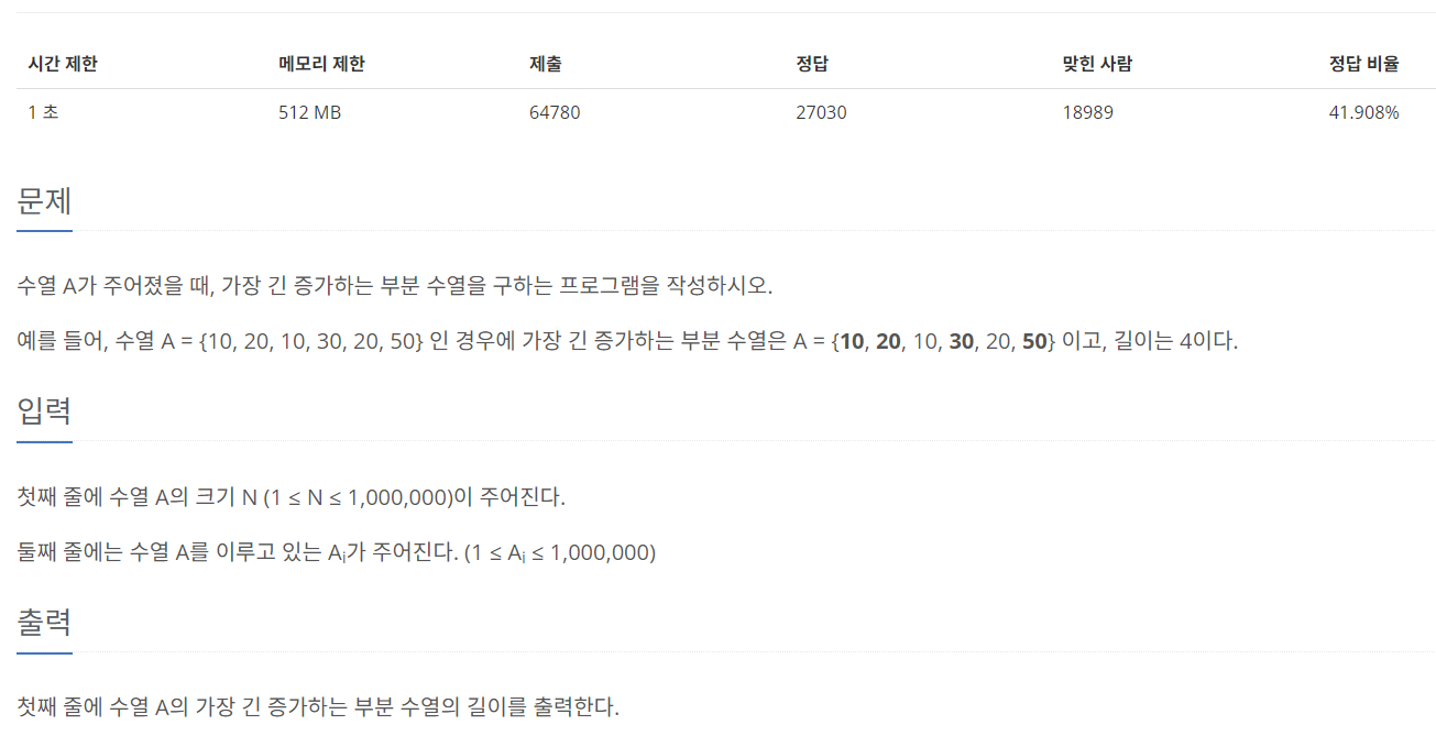가장 긴 증가하는 부분수열 문제(LIS, 11053)보다 입력값으로 주어지는 수열의 크기와 수열을 이루는 각 숫자의 범위가 1000배 커졌다.